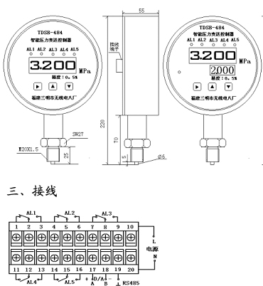 例:TDSB-484ZL智能壓力變送器,量程0~0.6MPa,RS485通訊接口,隔離膜片、接口、殼體都為不銹鋼,4位LED數顯,M20X1.5外螺紋壓力,徑向安裝,表壓型,3路報警。 |