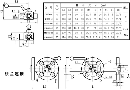 KHB3K型高壓三通球閥是依據(jù)國外資料研制而成,主要用于液壓管路中控制油液、氣的流通、流向和截止。本系列高壓多路球閥具有流阻損失小、密封性能可靠、操作方便、外觀精美等特點(diǎn)。本系列多路球閥主要由閥體、球體、閥桿、手柄和密封裝置等組成。閥體采用鋼質(zhì)鍛件,表面鍍鉻。同時也提供不銹鋼球閥。本系列高壓球閥主要有二種連接方式:內(nèi)螺紋連接、法蘭連接。