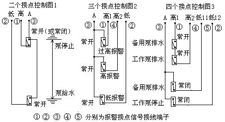 2)、二個報警信號:接點為常開,位置出廠設置在最高和最低位置;三個報警信號:均為常開,高2設在 50%,四個報警信號:高1高2為常開、低11低12為常閉,高2設在85%、低12設在15%,接線端見下圖,若有不同要求請說明,報警位置用戶也可自行調整。