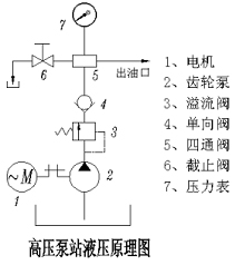 電動機通過聯(lián)軸器直接帶動齒輪泵泵油,壓力油經(jīng)過溢流閥調節(jié)通往單向閥到達四通集成塊,分別供給壓力表、調節(jié)截止閥和用油對象供油;