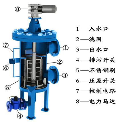 的排污閥;馬達帶動本體濾網(wǎng)內的兩把不銹鋼刷轉動,被濾網(wǎng)所